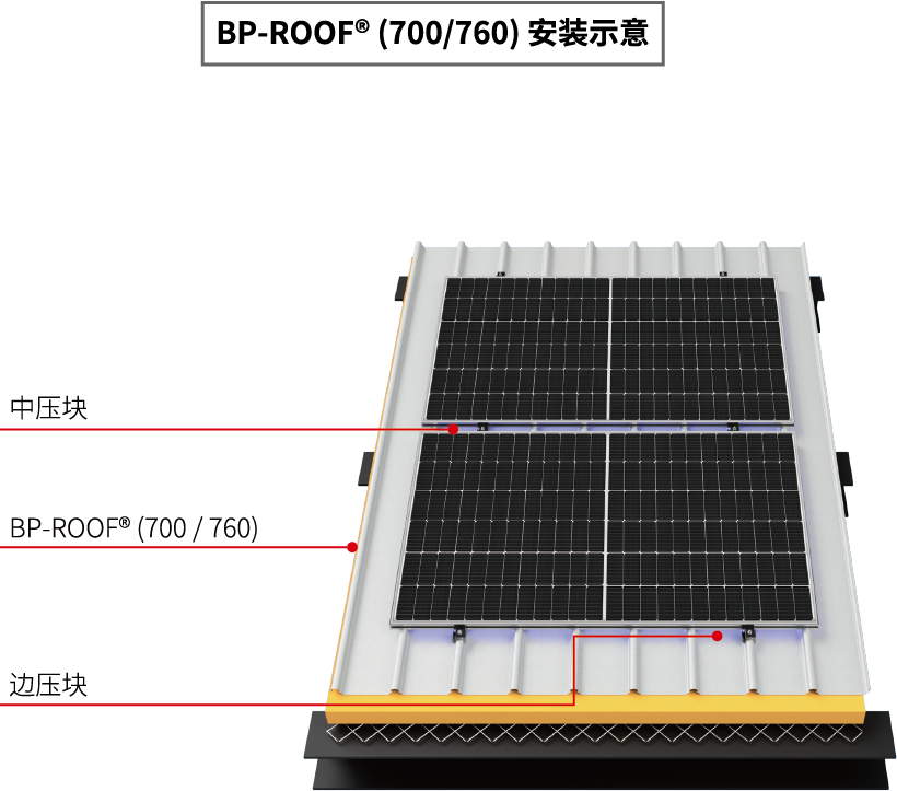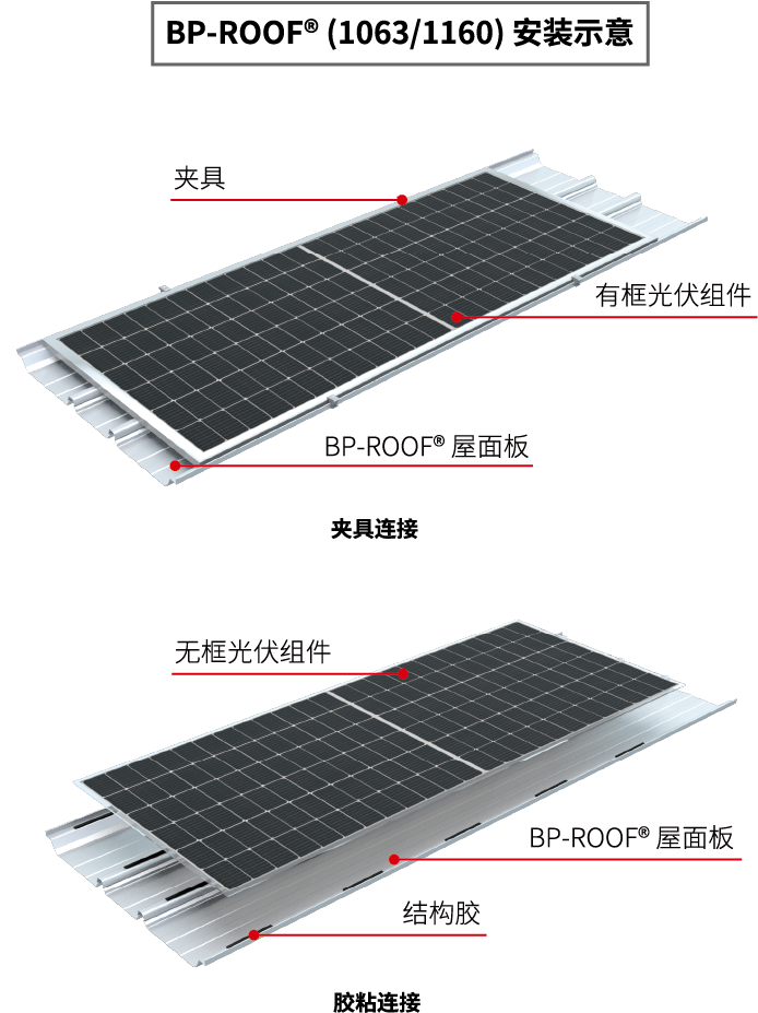 鋼之杰BP-ROOF?光伏專用底板系列:BP-1063/1160、BP-700/760,能適用于行業(yè)常規(guī) 166/182/210光伏組件,具有完善的節(jié)點設(shè)計和極佳的安裝方式。